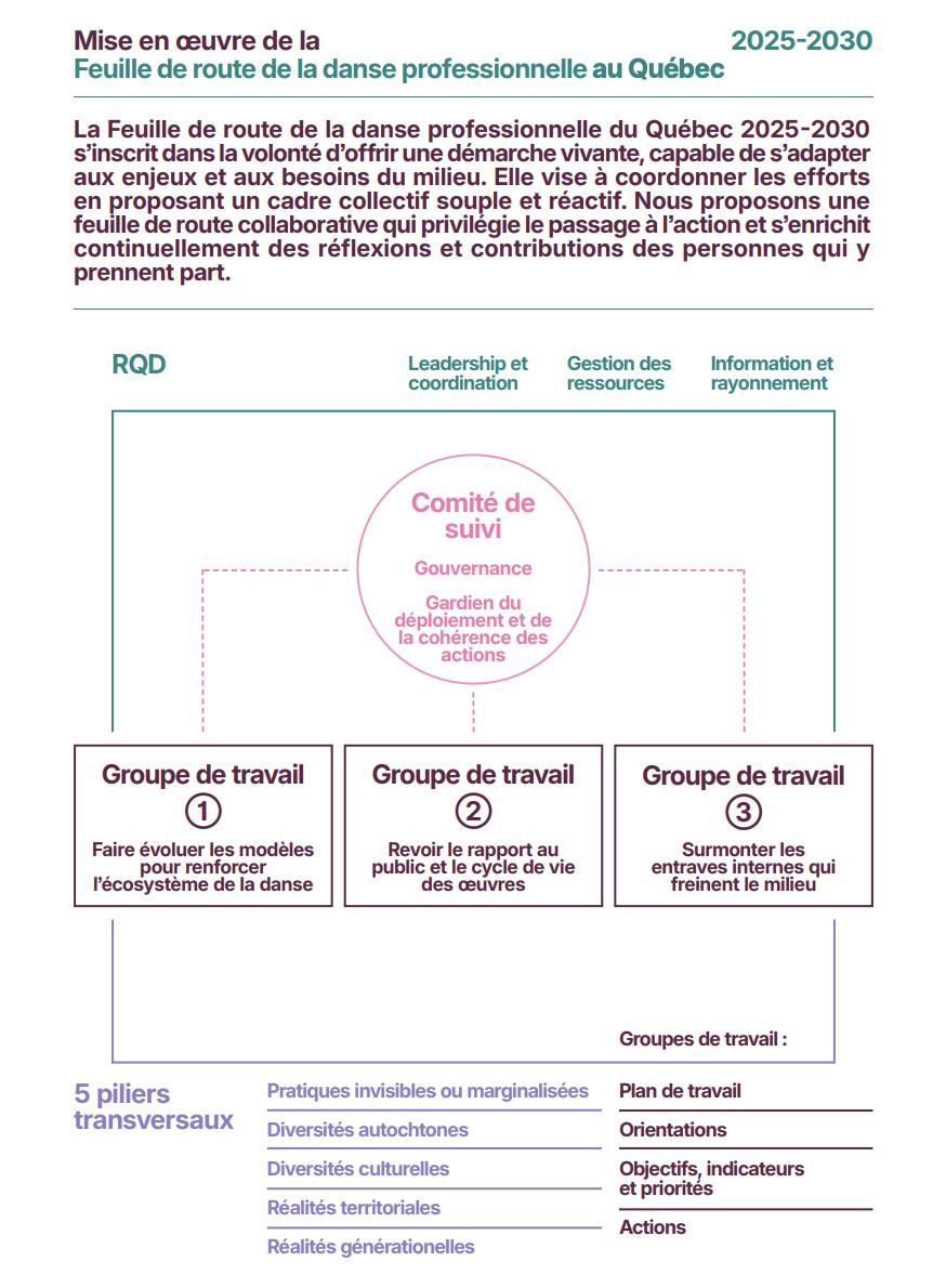 Le milieu de la danse, riche dʼune énergie unique et dʼinitiatives multiples, ressent plus que jamais le besoin de se consolider comme véritable écosystème. La Feuille de route de la danse professionnelle au Québec 2025-2030 (FDR) propose de renforcer cette dynamique collective, en offrant des espaces communs de concertation, afin dʼexplorer ensemble des pistes porteuses pour faire face à une réalité économique, sociale et institutionnelle en constante évolution.