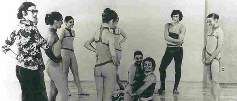 Mention photographique: Le Groupe Nouvelle Aire en répétition: on y voit Martine Époque, Johanne Vita, Michèle Bertrand, Monique Giard, Louise Gauvreau, Sylvie Pinard, Paul Lapointe, Philippe Vita et Solange Paquette, 1972. © Inconnu, Bibliothèque de la danse Vincent-Warren