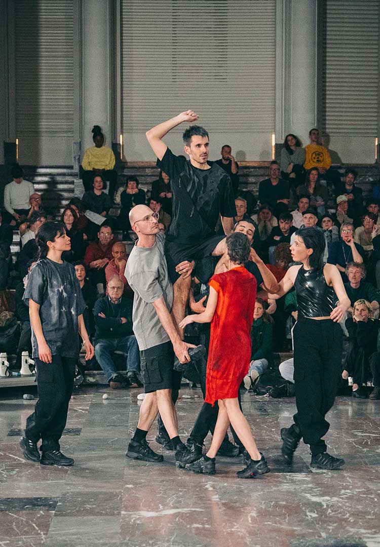Sur scène, sept interprètes — trois musiciens et quatre danseurs — partagent le même espace, brouillant les frontières entre corps et instruments. La pièce explore comment un mouvement individuel peut devenir un acte commun.