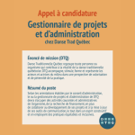 Les candidatures seront reçues par courriel au : administration@dansetrad.qc.ca par envoi d’une lettre de présentation et d’un curriculum vitae.