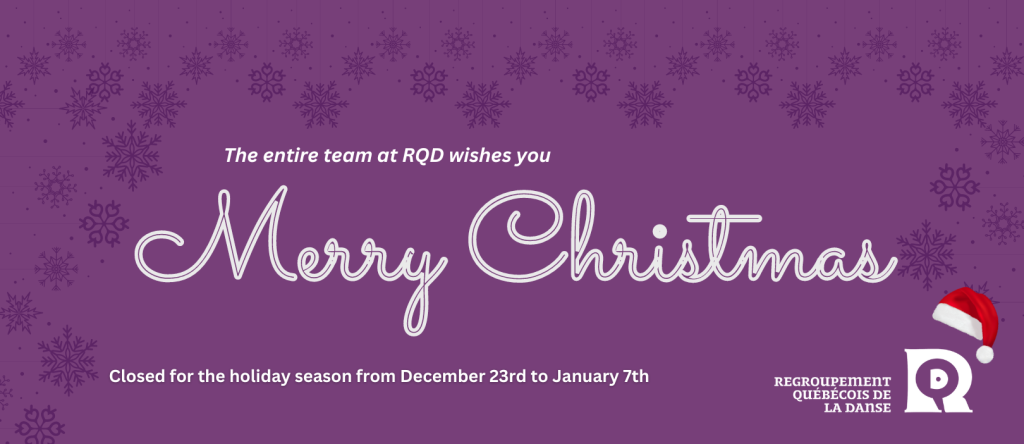 As the festive season approaches, we would like to inform you that the RQD offices will be closed from December 23rd to January 7th. We will use this break to recharge and return in 2024 with even more energy and exciting projects to support and celebrate dance throughout Quebec.