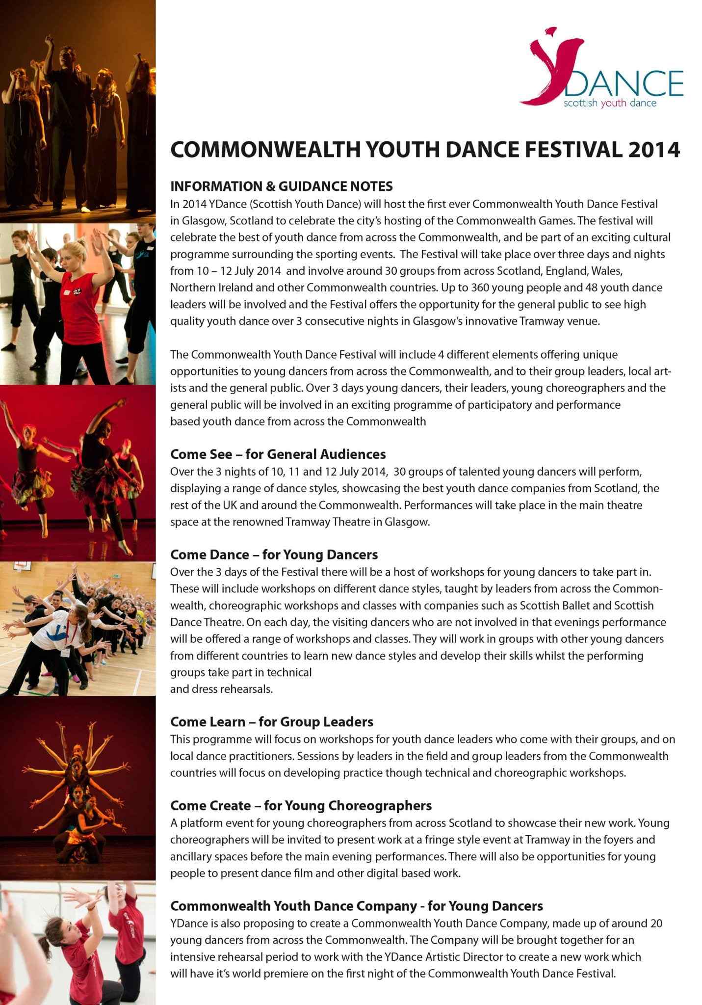The Commonwealth Youth Dance Festival 2014 is an exciting opportunity for young dancers from Canada to come to Scotland and work with their peers from across the Commonwealth in 2014.